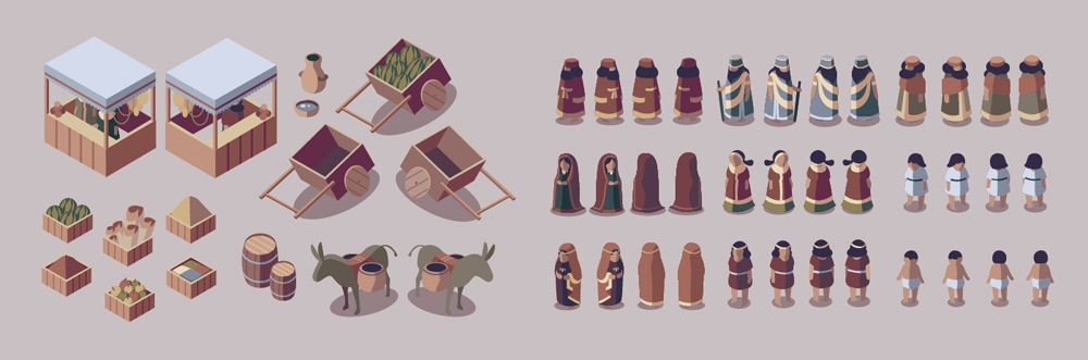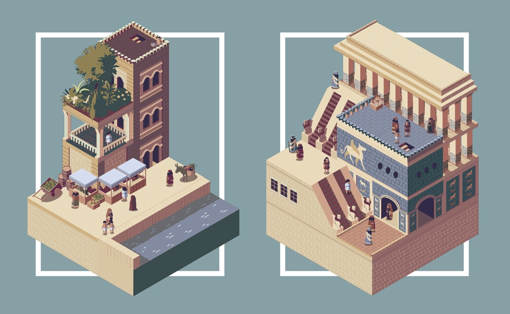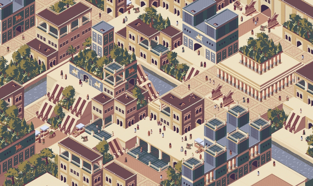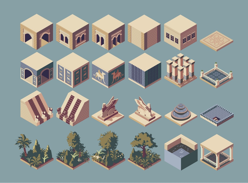 The more blocks - the more variations. My goal was to create a number of isometric elements that can be combined into different kinds of buildings and cities. A good example for the use of this technique is building worlds for computer games. The blocks were modelled after the ancient Mesopotamian city of Babylon because of its rectangular shapes and distinct colour contracts.