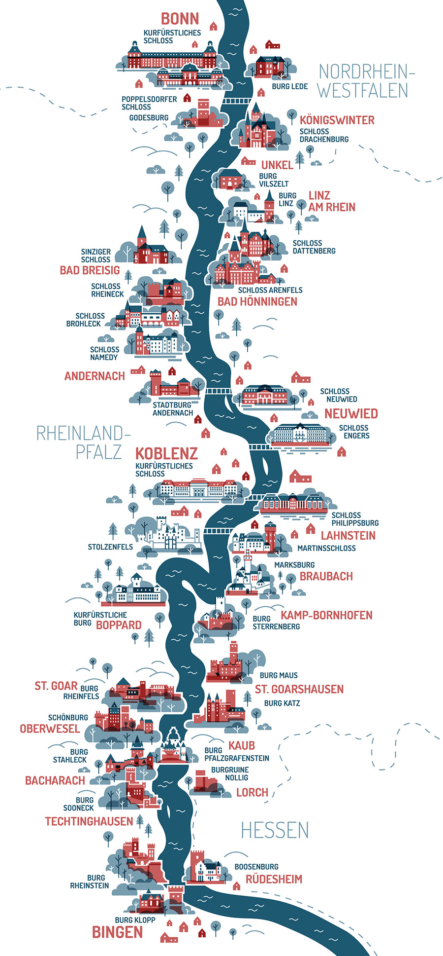 The Rhine between the cities of Bingen and Bonn is a major tourist attraction. Here you can find a remarkable number of medieval castles as well as baroque palaces. As a personal project I've decided to create a map that feels very modern while showcasing these traditional historical sites.