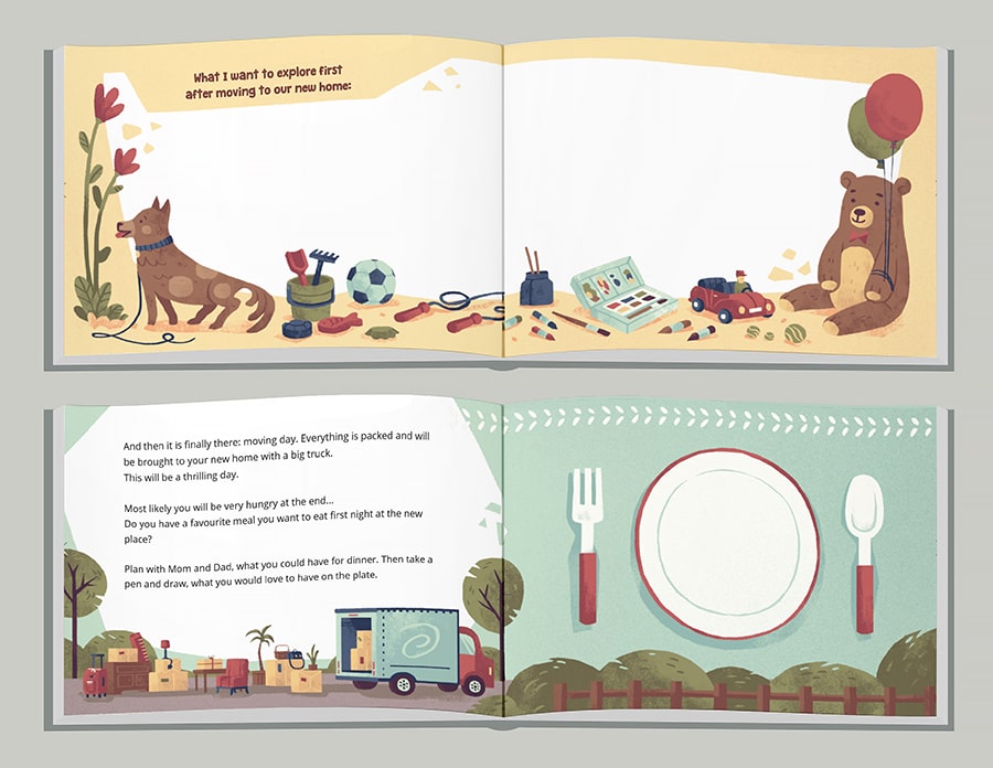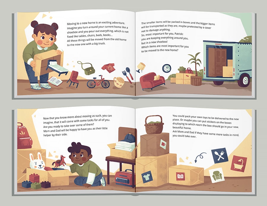 CUKIBO is a Swiss Start-Up, creating unique customized kids' books. Employing cutting edge technology and the latest research in cognitive, emotional & language development in children, CUKIBO books help kids and parents navigate an ever changing world. Their storybooks promote diversity, tolerance and openness, considering a non-stereotyping approach and different family structures. In 2019 I had the pleasure to illustrate „My New Home“. It is a customizable book and the perfect companion when moving with a child. The book can be individualized with the name of the child as well as with the name(s) of the parent(s)/guardian(s). Additionally clients can choose from 24 different boy and girl looks while configuration the book to enable little ones recognizing themselves in the story. The book's concept was created by Kathrin Bute.