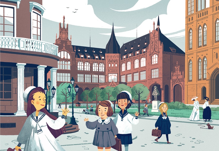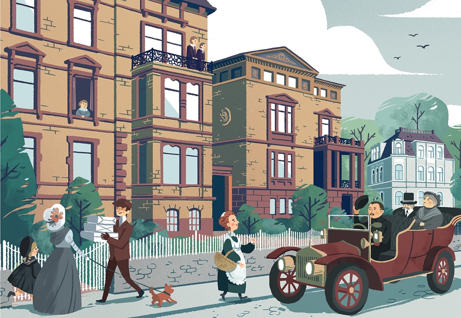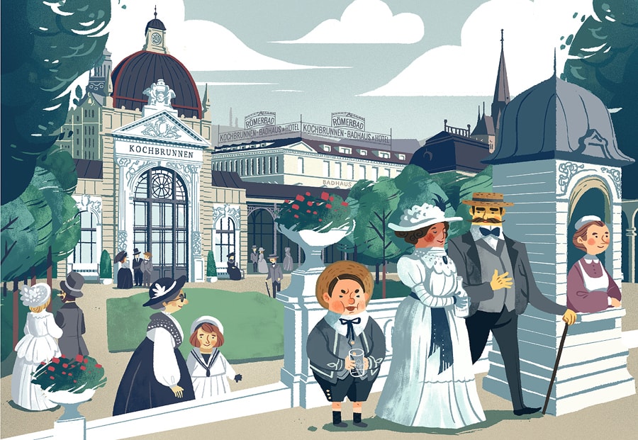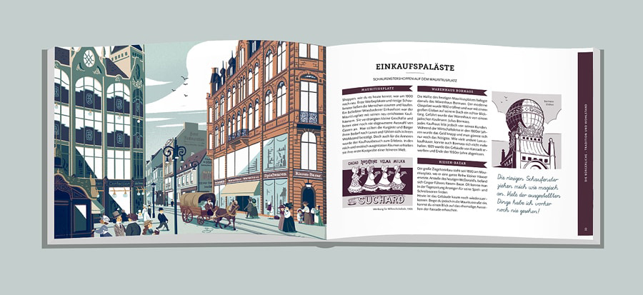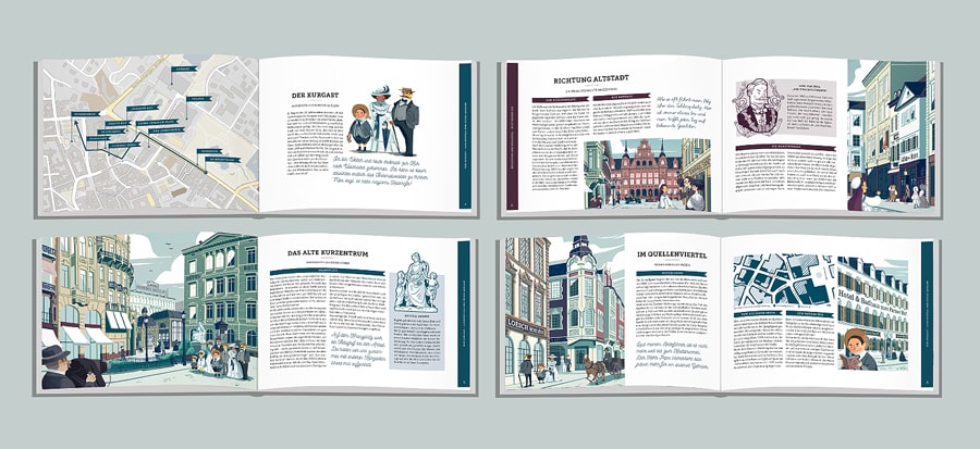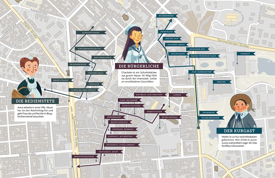 Walking through Wiesbaden means being surrounded by beautiful old architecture. Throughout the 19th century the city experienced a period of great prosperity that culminated around 1900. This book sends its young readers back in time. Each chapter features another main character on their way through the old city while maps help you to carefully follow their routes. Lage colourful illustrations depict popular places in Wiesbaden. Experience the city through the eyes of a tiny tourist, a wealthy school girl and a young servant. This book is my bachelor's thesis in communication design at the RheinMain University of Applied Sciences. This work has also earned a sponsorship award by the Johnannes Alexander Schroth Foundation in Wiesbaden. In November 2018 the book was published by the city of Wiesbaden and sold in local book stores.